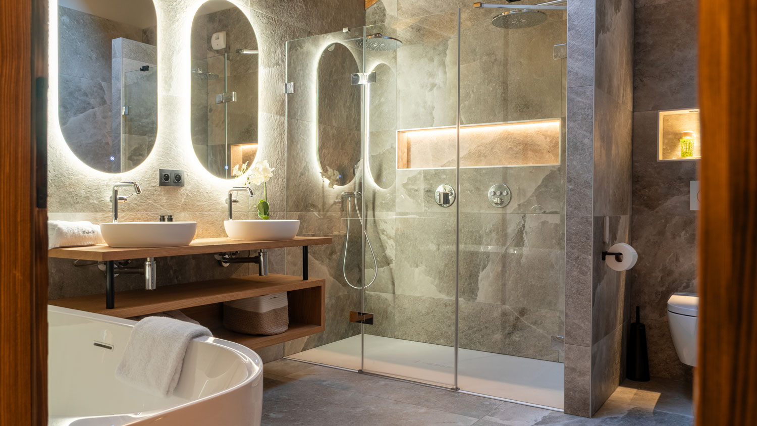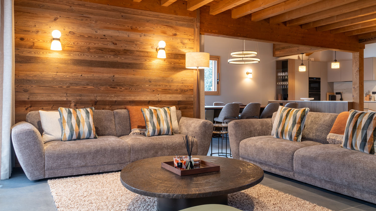 The main living space sits at the heart of the home—open, light-filled, and oriented towards the surrounding alpine landscape. It’s a space designed for both relaxation and entertaining, where generous proportions are softened by layered lighting and tactile finishes, creating a warm and inviting atmosphere.